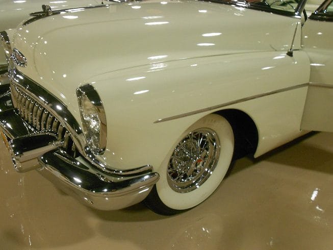 Of special note is that the Buick Roadmaster Skylark sported genuine Kelsey-Hayes wire wheels. The Kelsey-Hayes wire wheels made to Buick specifications and sported red, white and blue “50th anniversary” emblems in their hubs. Another standard feature mentioned above were a leather interior and reshaped wheel openings.