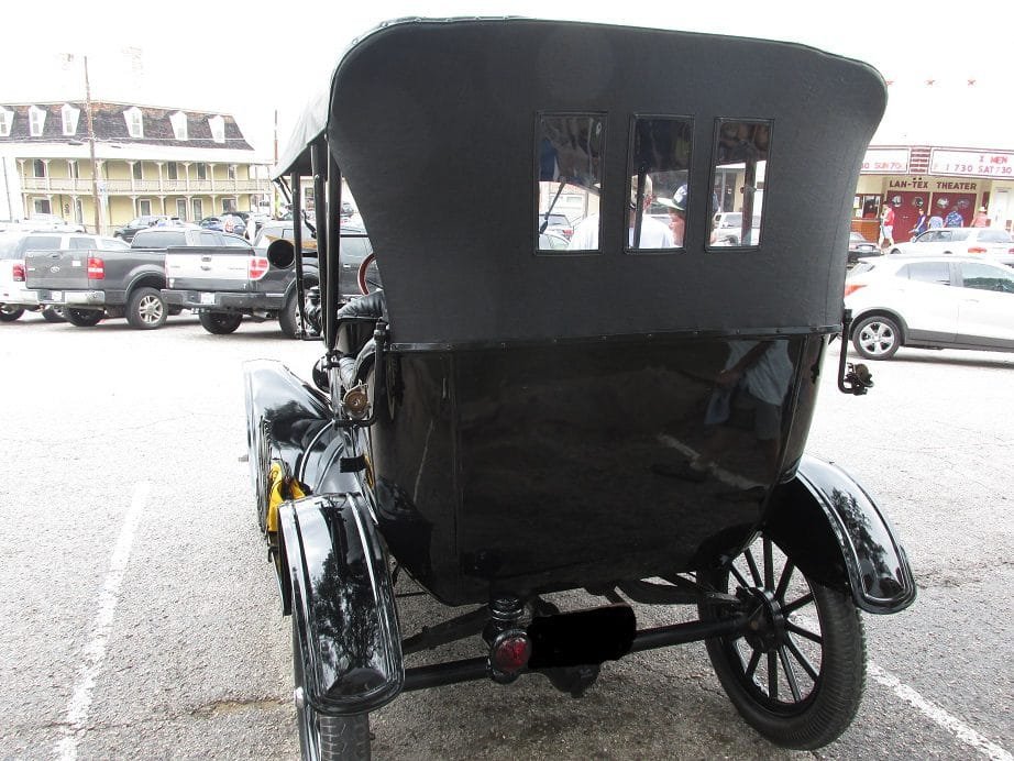 The car had a hand crank for an engine starter. Brakes were not what we now consider to be brakes. Braking the car was performed by a contracting band on a drum in the transmission. There were hand-lever operated emergency mechanical brakes on the rear wheels, which were really only effective for parking the car.